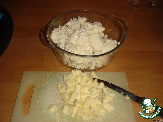 1. Масло сливочное режем кубиками, добавляем к творогу