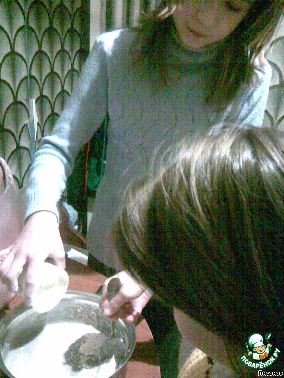 Катя постепенно досыпает муку, Маша перемешивает до однородности.