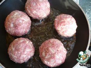 Обжарим получившиеся шарики на сковороде на большом огне, чтобы фарш покрылся легкой корочкой -