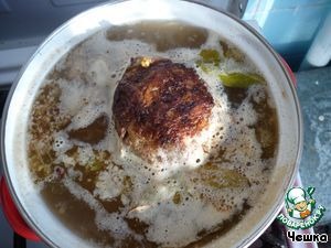 Обжарив шарики со всех сторон, кладем их в кастрюлю и зальем кипятком. Стараемся заливать воду так, чтобы она не попадала напрямую на "глаза", иначе они могут развалиться.