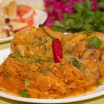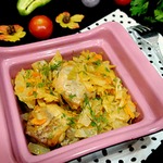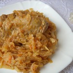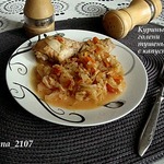 В кружке смешать томатную пасту, сметану, разбавить немного водой и залить полученным соусом капусту с курицей. Аккуратно перемешать, точнее сказать, пошевелить капусту, особенно ту, что снизу, накрыть крышкой и тушить до готовности капусты и мяса. -