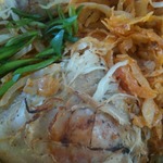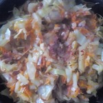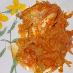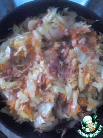 Немного луково-морковной массы отложить на тарелку, а поверх оставшейся выложить бОльшую часть капусты, слегка посолить, посыпать приправой и перемешать.