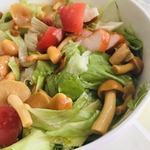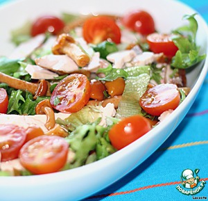 Теплый салат с кисло-сладкой заправкой, хрустящими листьями фриллис, копченой куриной грудкой и маринованными опятами. "Gorenje: новогодняя композиция"