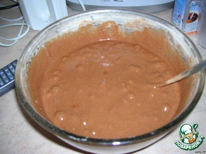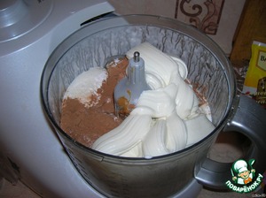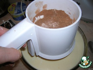 Добавляем 160г. муки, смешанной с 1 ч.л. разрыхлителя, 5 ст.л.какао-порошка, 1 ст.л. крахмала, просеиваем. И аккуратно перемешиваем.