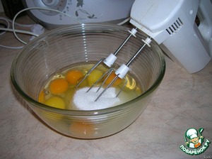 Сначала выпекаем бисквит. Взбиваем 6 яиц, 200г. сахара, добавляем 4 ст.л. горячей воды.