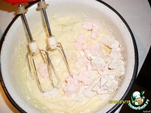 Добавляем порезанный кубиками зефир, ванильный сахар, масло. Взбиваем все вместе.