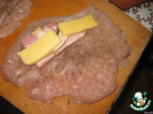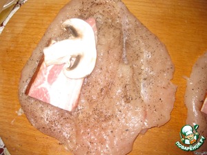 НА край отбивной выложить кусочек копченой грудинки, пластинку шампиньона (я кусочек грибочка для сочности кладу, можно и без него).