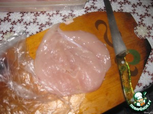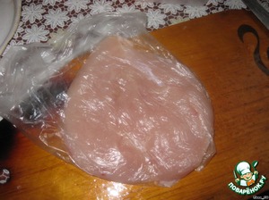Завернуть в целлофановый пакет и аккуратно отбить. (Можно целлофановый пакет надеть на молоток, чтобы мясо не приставало.)