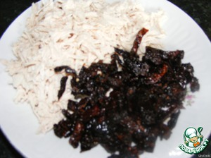 Пока варится паста, порезать вяленые томаты, грибы, лук, вареную грудку разобрать на волокна.