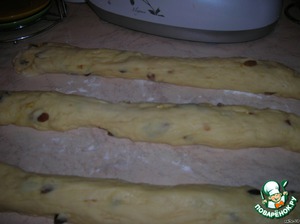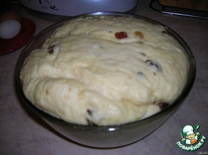Добавить в тесто изюм, 3 ст.л. рубленого миндаля. Замесить тесто. Оставить на 50-60 мин.У меня поднялось быстрее.