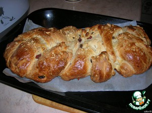 Сплести косичку и закрепить концы. Выложить на противень, застеленный пекарской бумагой и смазанной маслом.