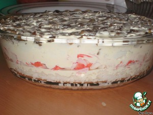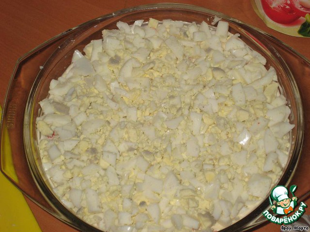 2-й слой – нарезанные крабовые палочки + майонез