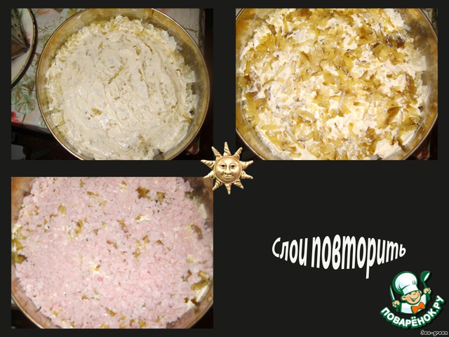 Слои повторить: картофель, немного майонеза, оставшиеся огурцы и ветчину.