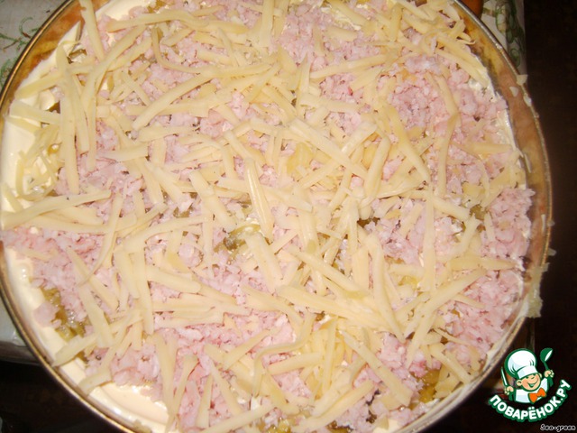 Сверху выложить половину натертых огурцов и часть ветчины. -
