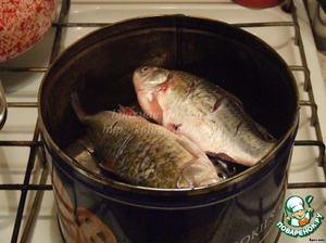 Засыпаем в коптилку, сверху на решетку ставим рыбу.