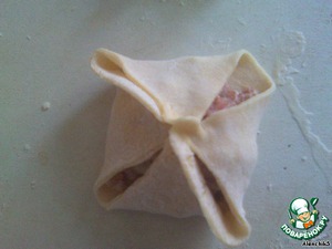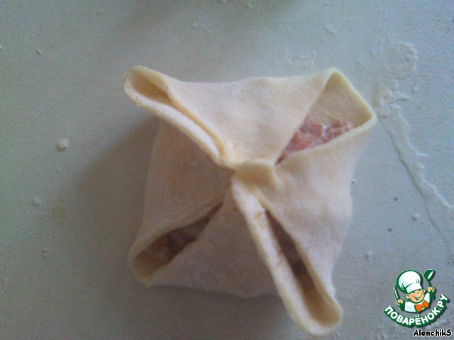 Тесто режем на небольшие порции, ТОНКО (как на пельмени) раскатываем и режем на квадраты не менее 10 см х 10 см. В центр каждого квадрата выкладываем фарш