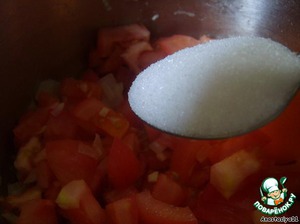 Добавить чеснок, помидоры, сахар и тушить еще около минуты.