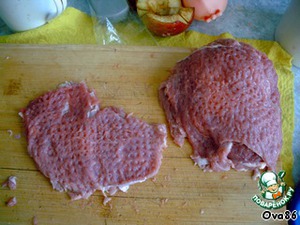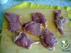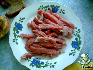 Мясо нарезать тонкими ломтиками,