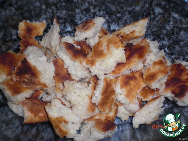 Измельчаем наш корж, кусочки где-то 3*3 см.