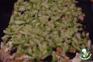 Маринованные огурцы нарезаем мелкой соломкой, выкладываем на грибы. Смазываем соусом.
