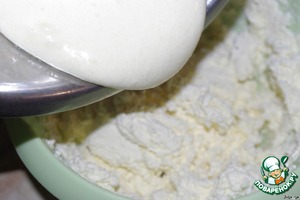 Белки соединяем миксером с основной массой. Лучше это делать на маленькой скорости, но всё-же миксером, чтобы хорошо смешались.