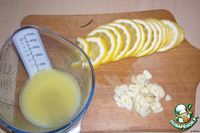Один лимон и весь чеснок нарезаем на тонкие дольки. Из второго лимона выжимаем сок.