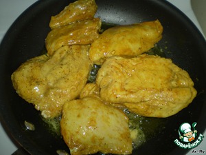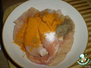 Куриную грудку(можно заменить темным мясом),посолить,поперчить и добавить куркуму.Хорошо размешать.