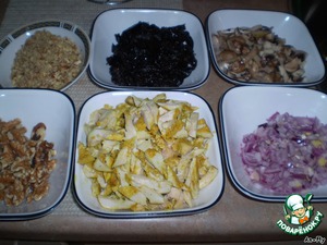 Размельчите часть орехов,нарежьте соломкой грибы,курицу,чернослив,натрите сыр.