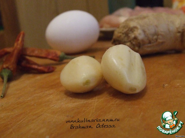 -масло разогрето. Помешивая, протушить чили, чеснок и имбирь