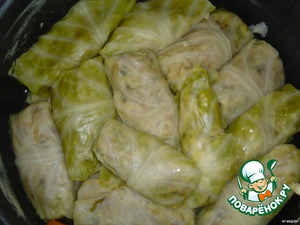 В кастрюлю нарезать ножку от капусты, морковь. Листья капусты фаршировать начинкой, выложить в кастрюлю плотно друг к дружке. Поверх выложенных голубцов положить перевёрнутую тарелку, меньшую диаметром, чем диаметр кастрюли. На тарелку поставим пресс (литровую банку, заполненную водой). В кастрюлю влить горячую, кипячёную воду, слегка залив тарелку.