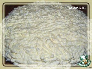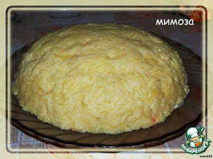 Берем желтки и трем на шапочку, получаем бусинку с веточки мимозы. При желании украшаем салат морковью и перьями зеленого лука.