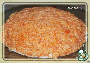 Морковь отварить, почистить, потереть на терке, добавить майонез и соль. Вновь перемешать и уложить на белки 1 ст. л. майонеза.