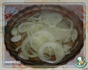 Луковицу очистить, тонко нарезать кольцами и залить кипятком, чтобы ушла горечь, на пару минут.
