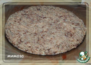 Отварить 4 яйца, отделить желтки от белков. Белки трем на терке, добавляем немного майонеза и соли. Перемешиваем и укладываем на рыбку.