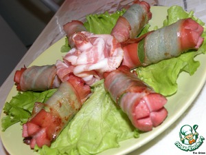 Одного пласта бекона мне хватило, чтобы завернуть 2 сосиски… ничем не закалывала…
