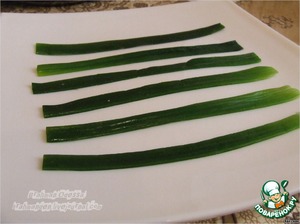 Отваренный лук высушиваем бумажными полотенцами и нарезаем на полоски, шириной около сантиметра и длиной около 15.