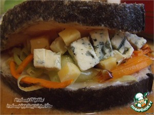 Начиняем. Кладем пару ложек морковки с луком и сыры. Все примерно, чтобы было и глазу радостно, и душе благостно.