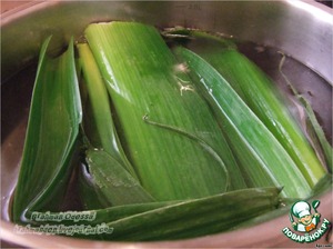 Достаем широкую кастрюлю, доводим литра 3 воды до кипения, солим, и варим зеленые листы порея 2 минуты.