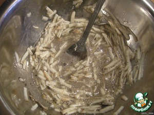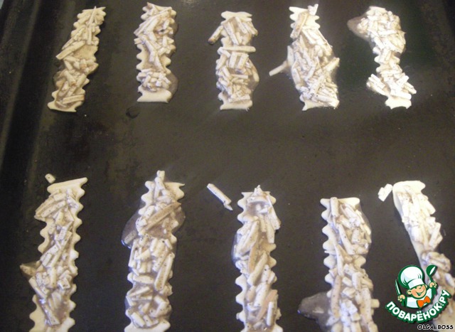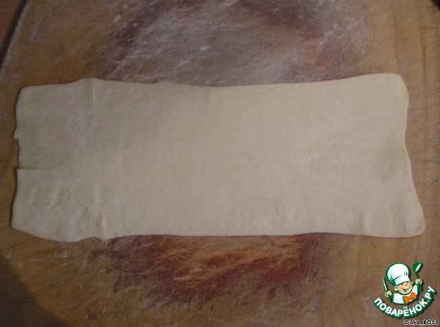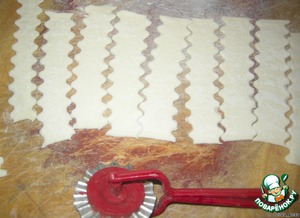 Нарезаем его на полоски. Отправляем их на противень подходить.