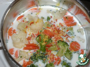 • Ставим овощи на огонь (выше среднего, но не на полную мощь, чтобы молоко не подгорело), заливаем молоком, добавляем зажарку...