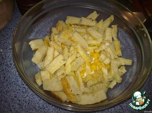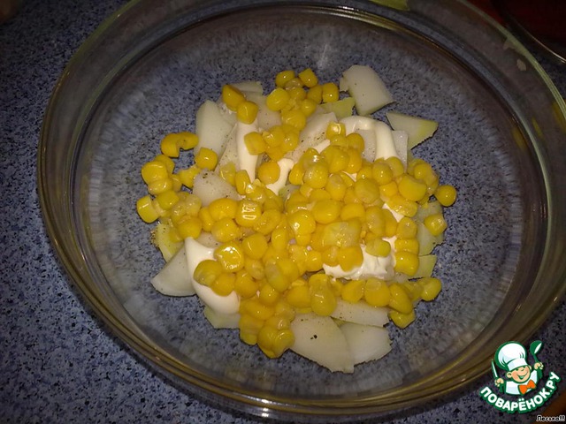 • Картофель отварной - лучше в мундире, у меня был обычно сваренный, режем кусочками. Посыпаем кукурузой