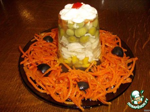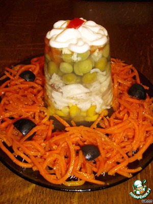Перед подачей на стол окунуть стаканчики в горячую воду на несколько секунд и перевернуть на блюдо или тарелку. У меня в этот раз было порционно с корейской морковочкой.