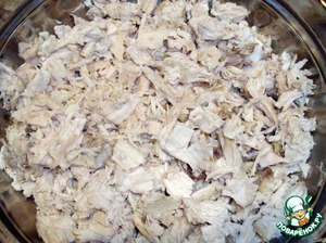 Когда курица будет готова, достаем ее, снимаем мясо с костей и мелко нарезаем. Бульон процеживаем. -