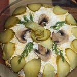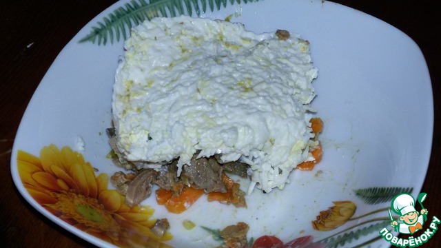 Для третьего слоя грибы смешиваем с небольшим кол-вом майонеза и выкладываем на овощи.