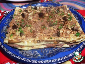 9 шаг - Второй корж - Чуть майонеза, лук, морковь и грибы.