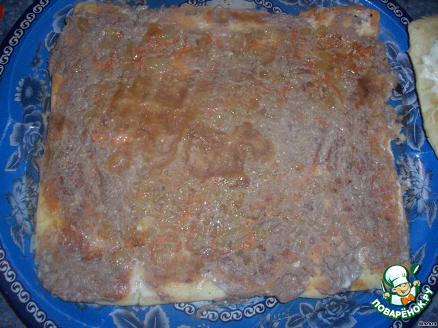 Равномерно распределяем паштет и лук с морковкой. Это первый корж.