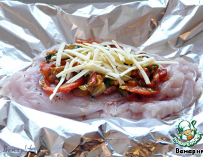 Полученную смесь разложить на кусочки филе, посыпать тёртым сыром, завернуть в фольгу