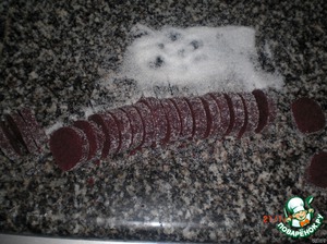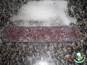 Сформировать колбаску толщиной в 5 сантиметров, обвалять в сахаре, замотать в плёнку и поставить в холодильник на 1 час (я не ставила). -