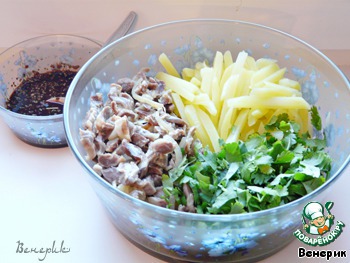 В чашке смешиваем нарезанную кинзу, желудочки, картошку, заправляем соусом.