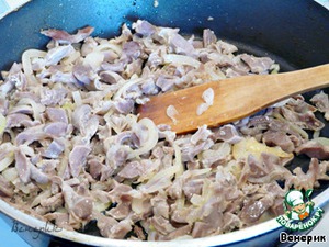 Лук нарезаем полукольцами и обжариваем вместе с желудочками на растительном масле до золотистости.
